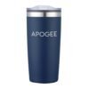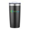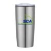 This 20 Oz. tumbler is constructed with a stainless steel exterior and plastic liner, which keeps drinks hot or cold for hours.