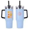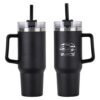 The Maxim 40 oz Mug with Straw is a popular dupe for retail. Made of stainless steel with a matte finish that is vacuum-insulated and double-walled. Comes with clear screw-on lid with a high-wall leak resistant feature, and has 3-position black swivel top. Also comes with black plastic straw with ring to keep it inside, and black plastic handle that is 4″ tall and sticks out 1-1/4″ at the widest part. Keeps drinks hot or cold for up to 6 hours. Hand wash only. BPA Free and FDA certified. Complies with FDA, Prop 65. 10.375″ H x 3.75″ Diameter