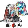 The Premium 210D Polyester Sublimated Drawstring Cinch Up Backpack offers a blend of style and functionality. Constructed with high-quality 210D material, this backpack features a spacious 15″W x 18″H size, providing ample storage. The drawstring closure ensures easy access, and the bottom is adorned with a triangular leather accent. What sets it apart is the full-color sublimation printing, allowing for vibrant and intricate designs, making it a unique and eye-catching accessory. 15″ W x 18″ H